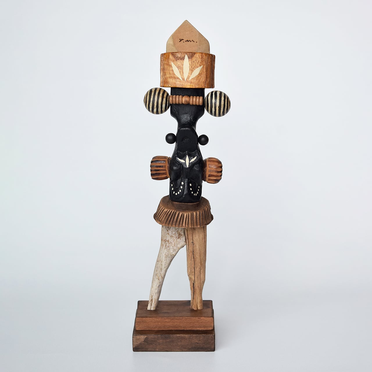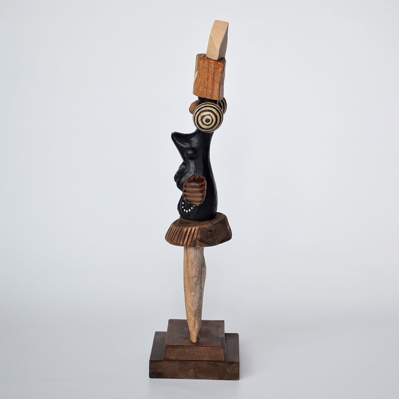 色々な木製素材をブリコラージュして人形のような彫刻に仕上げています。