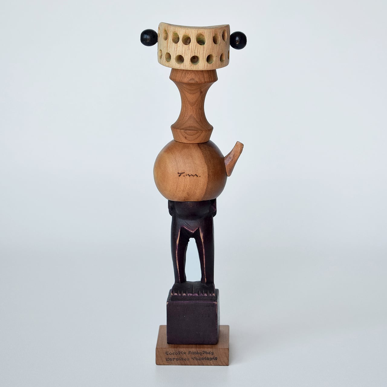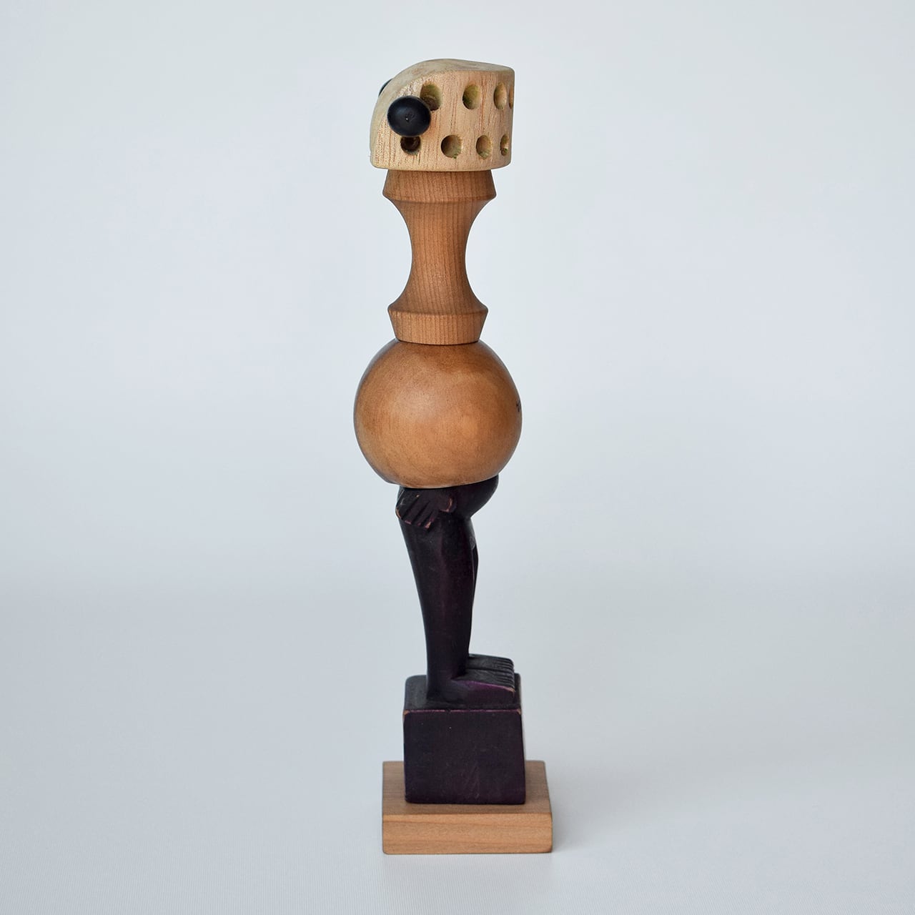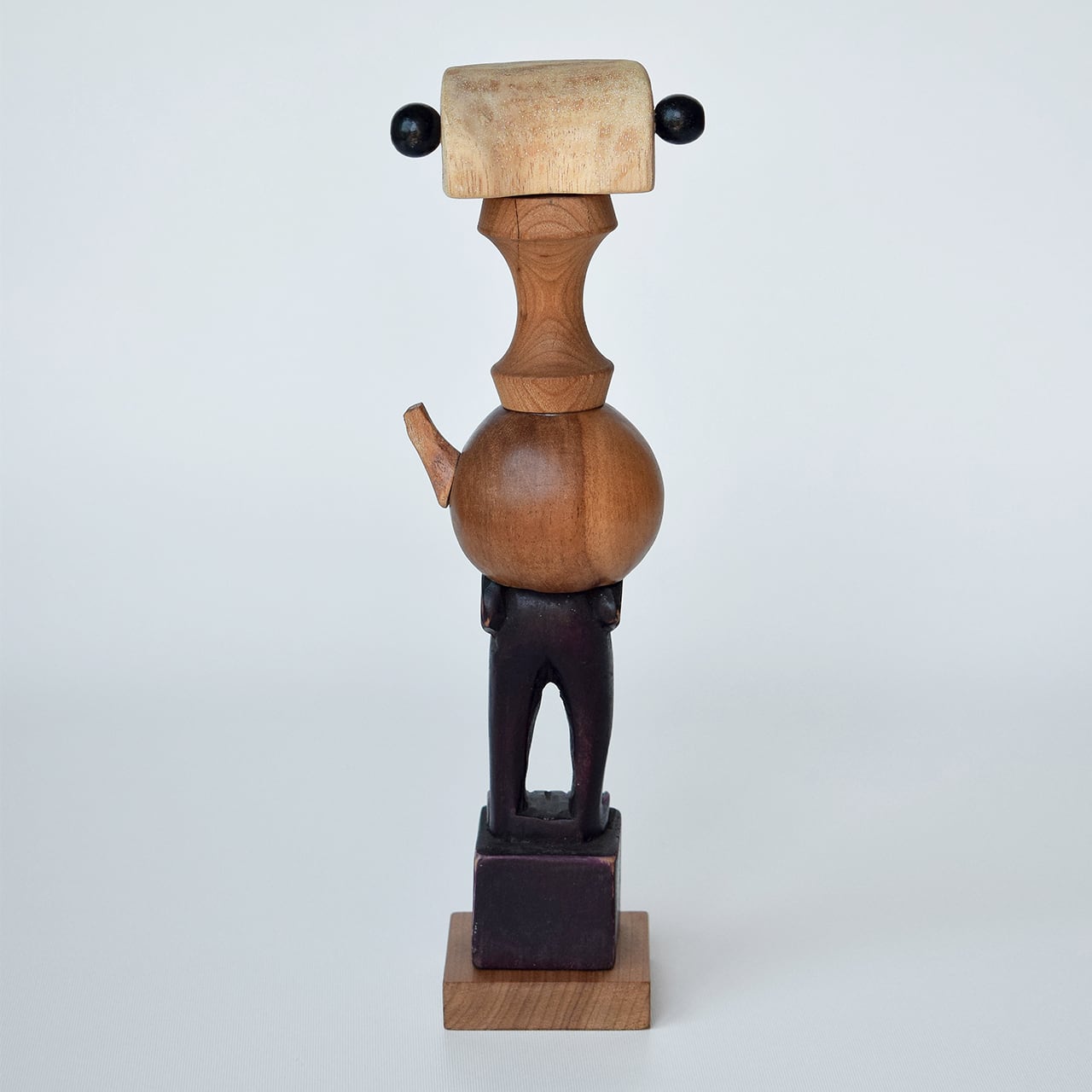 色々な木製素材をブリコラージュして人形のような彫刻に仕上げています。