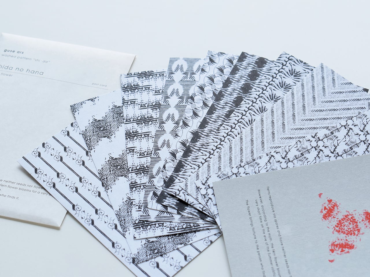 シダ植物をテーマに制作したパターンがおさめられたポストカードです。夏至の夜にシダの花を見つけた者には幸せが訪れるという神話に基づき、シダの茂みから架空の花を探すような10枚のカードセットです。