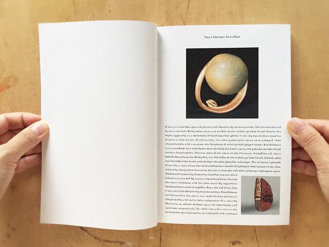 星「Star」とも、彫像「Statue」ともとれるような物体の塊をコラージュで表現し、その物体群を『StarTue』と名付けています。StarTueには、新しく作成した架空の文字で星の名前や説明が添えられています。
